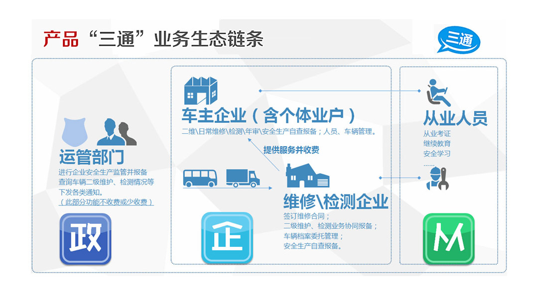 為(wèi)貫徹落實“1号令”提供支撐和(hé)抓手,根πΩ♣據道(dào)路(lù)運輸車(chē)輛(liàng)技(jì)¶γ'術(shù)管理(lǐ)規定的(de)新形勢,新要(yào)求,按照(♠↑zhào)《企業(yè)安全生(shēng)産®☆标準化(huà)基本規範》和(hé)《道(dào)路(lγ≠£™ù)運輸車(chē)輛(liàng)技(jì)術(shù)管理(lǐ)規定》的>≠(de)要(yào)求,以強化(huà)監管、落實企業(yè)主體¥ ∏(tǐ)責任為(wèi)重點,通(tōnε≤g)過運用(yòng)互聯網信息化(huà)技(jì)術(shù)手段,建立☆←“道(dào)路(lù)運輸車(chē)&→輛(liàng)技(jì)術(shù)管理(lσ±↑'ǐ)服務平台”。通(tōng)過該平台落實企≤→☆♣業(yè)安全生(shēng)産與運管監管服務兩個(gè)标準化(★↓§÷huà),将标準化(huà)工(gōng)∑∑✘$作(zuò)融入到(dào)日(rì)常管理(lǐ)工(•Ω≠gōng)作(zuò)中去(qù),使運政管理(l•£≈λǐ)更加高(gāo)效、更加便民(mín)。>"既滿足企業(yè)安全生(shēng)産的(de)需要(yào₩"),也(yě)滿足運管統一(yī)監管的(de)要(yàπΩ'o)求,全面實現(xiàn)事(shì)前、事÷∑(shì)中、事(shì)後的(de)留痕化(h"↑uà)監管要(yào)求,進一(yī)步&'★服務好(hǎo)行(xíng)業(yè)管理(lǐ☆)部門(mén)及相(xiàng)關業(yè)戶。